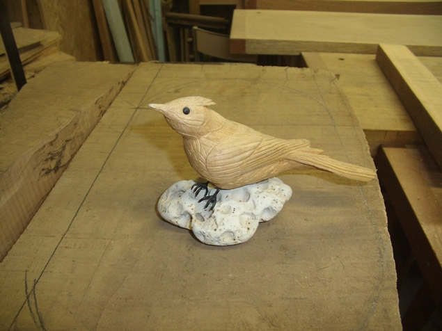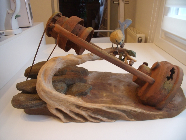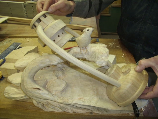 Un projet travaillé par étapes. La lanterne est realisée en tournage sur bois,puis une partie sculpture pour les rochers,la branche et l’oiseau, et un travail de finition, pour trouver la patine qui donne le rendu de rouille de la lanterne et imitation des rochers .
