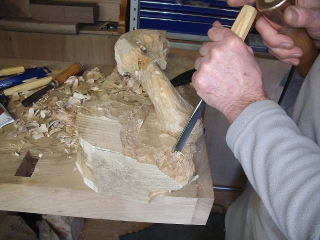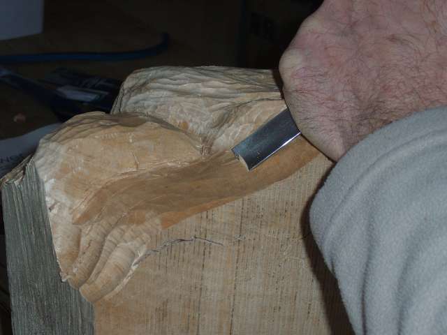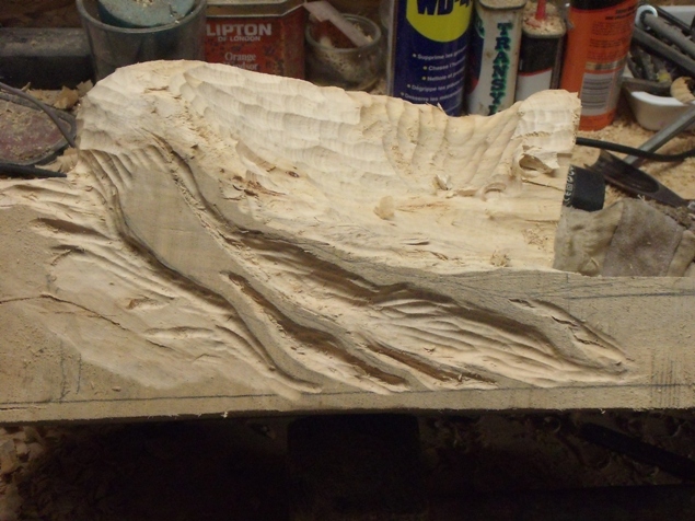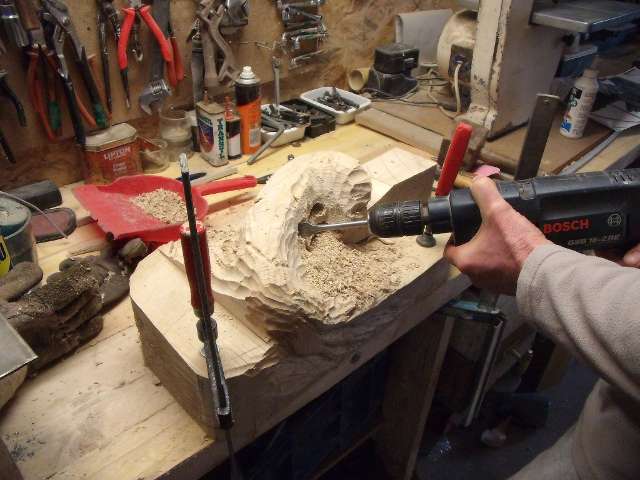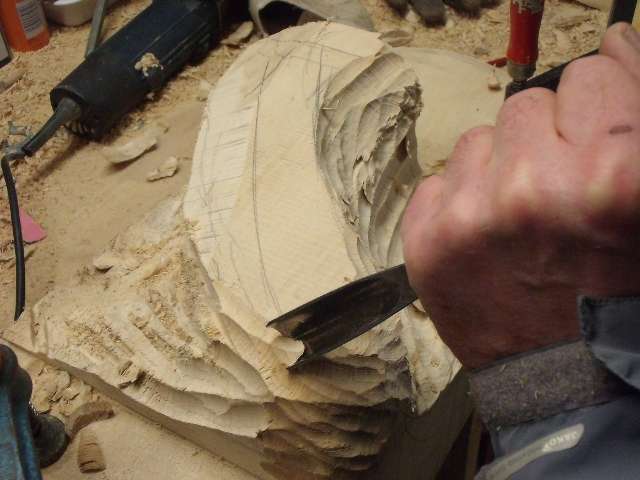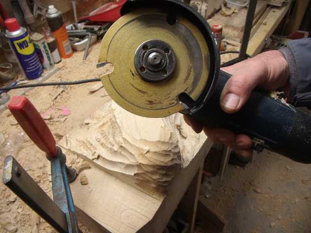 Je ne suis qu’un sculpteur débutant, dépourvu de matériels spécifiques, j’ai simplement acheter 2 gouges,et deux couteaux de sculpteur.Pour cette pièce j’ai tout simplement utilisé les outils dont je disposais, hormis le disque spécial qu’on m’a fait ésseyé.Le choix du bois est important.Ma pièce est totalement colorée avec différentes finitions, j’ai choisi le tilleul, facile à travailler